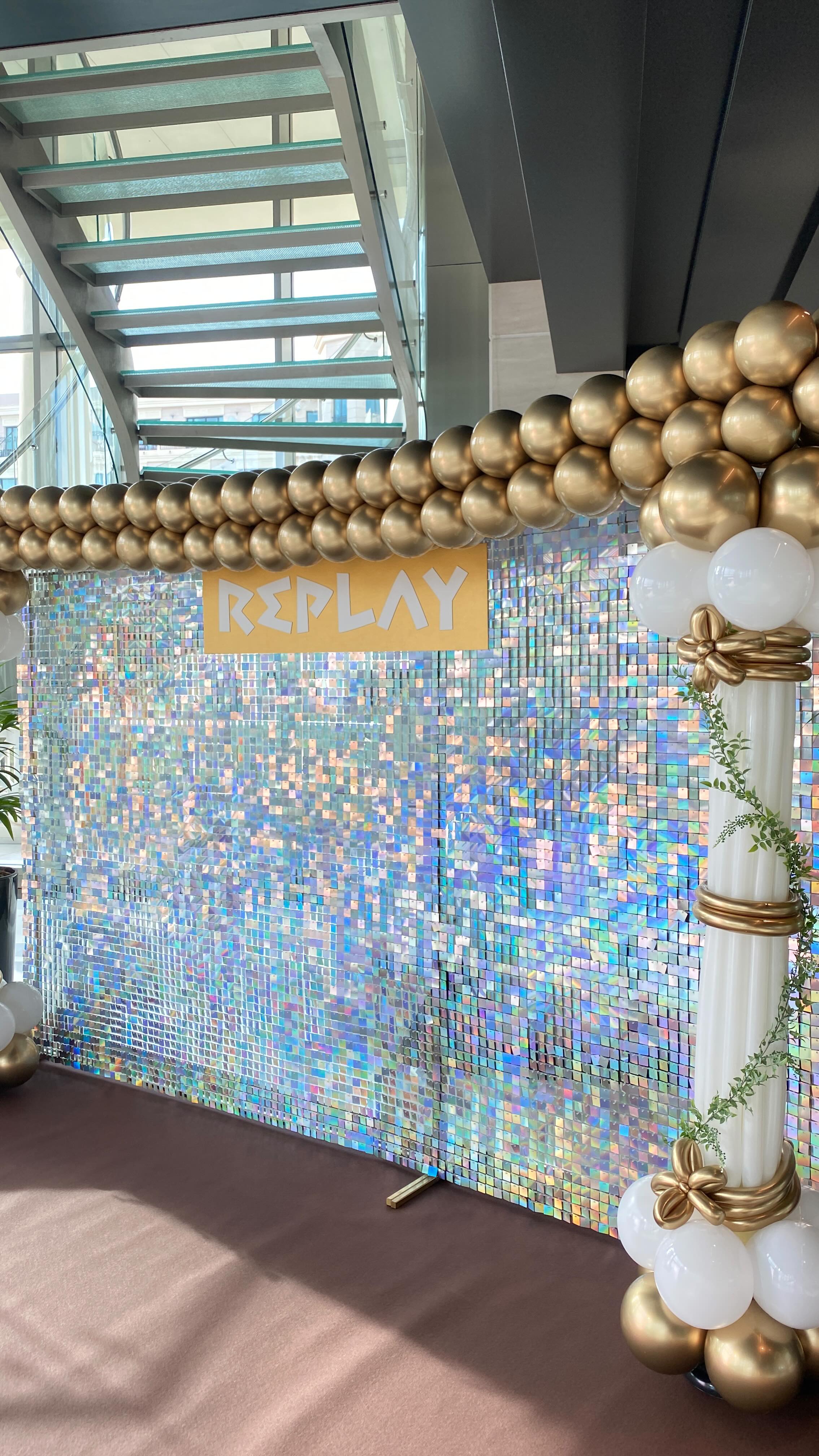 • Un impresionante photocall de 4 metros con trasera de lentejuelas, columnas y un friso personalizado con el nombre de la empresa. 🥳