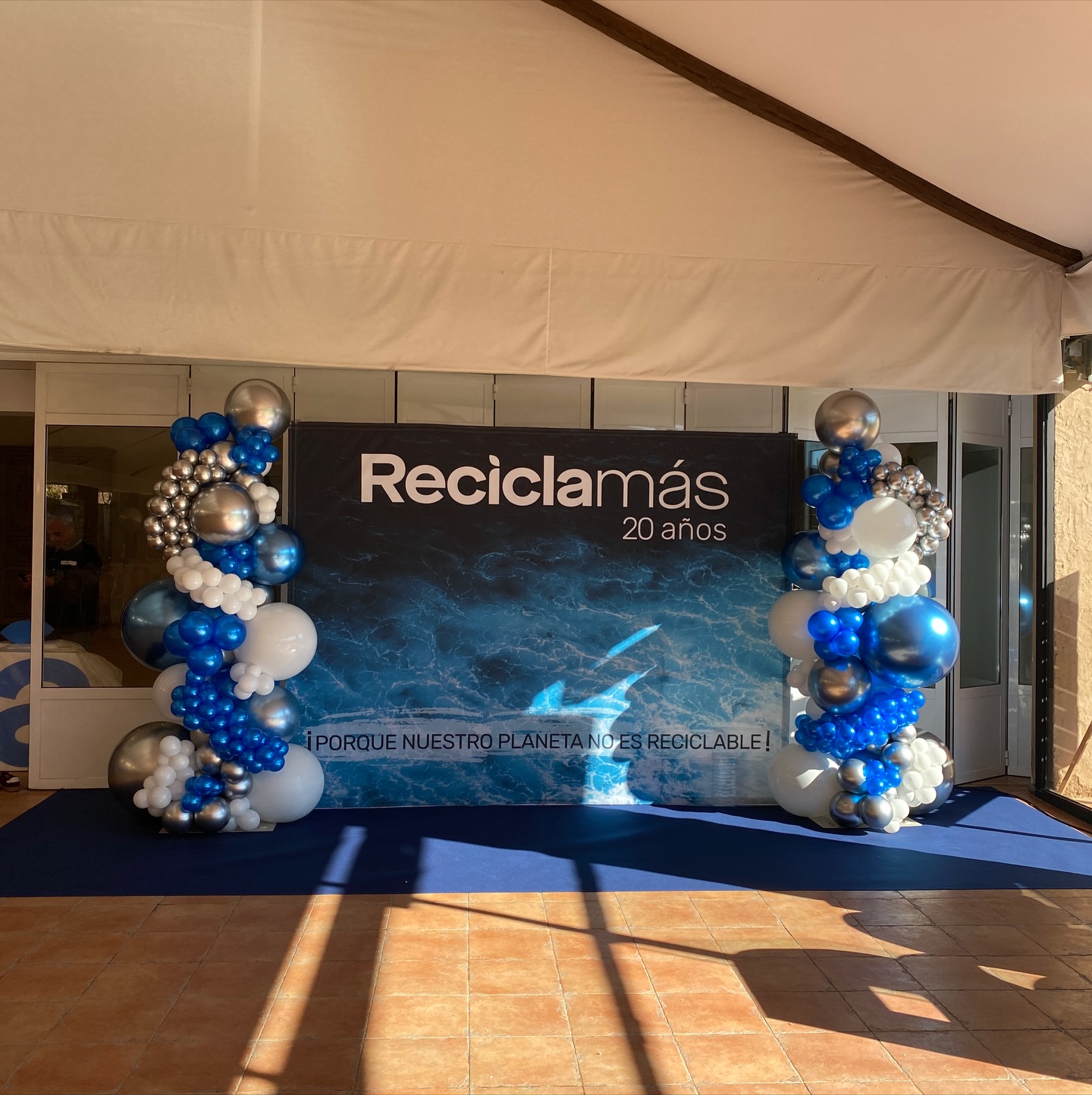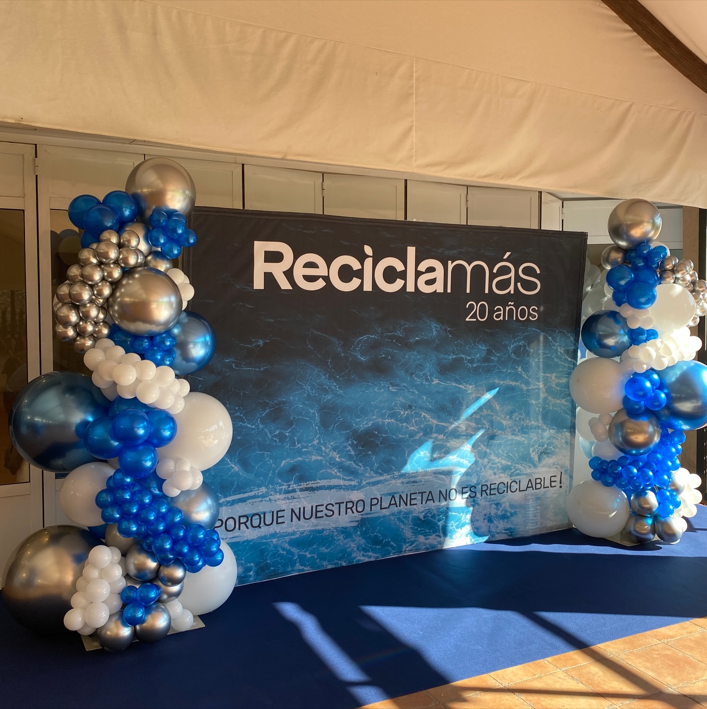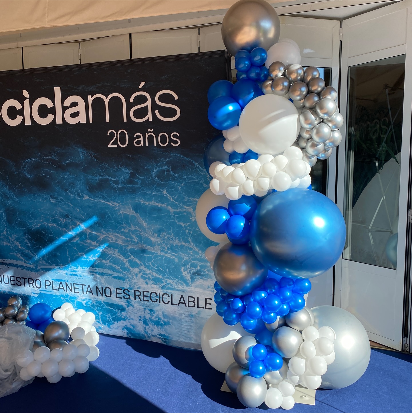 El photocall, con trasera de lentejuelas y globos en todo su perímetro, de látex biodegradable. Combinamos distintos tonos de azules y plata, complementado con un neón de @cristianveraprod “Bienvenidos al Futuro”